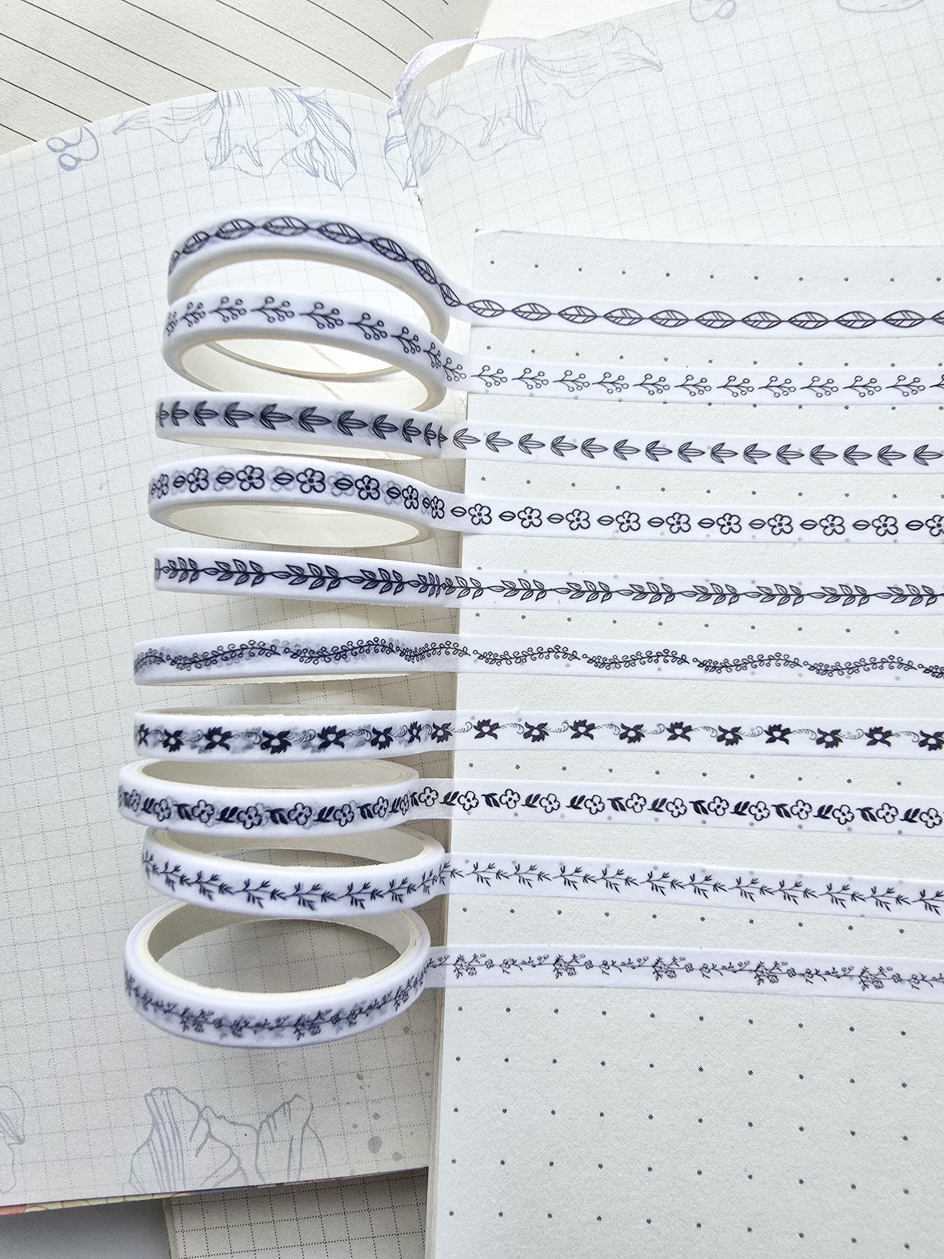 0816-8 Gardenia Thin Washi Tape Set of 10 Washi tapes | Japanese Washi Paper | 2 Meter each | Black n White