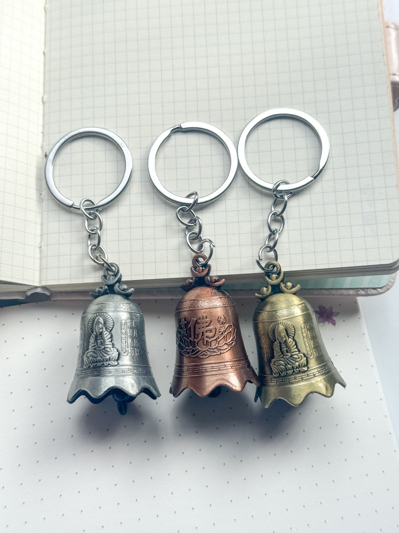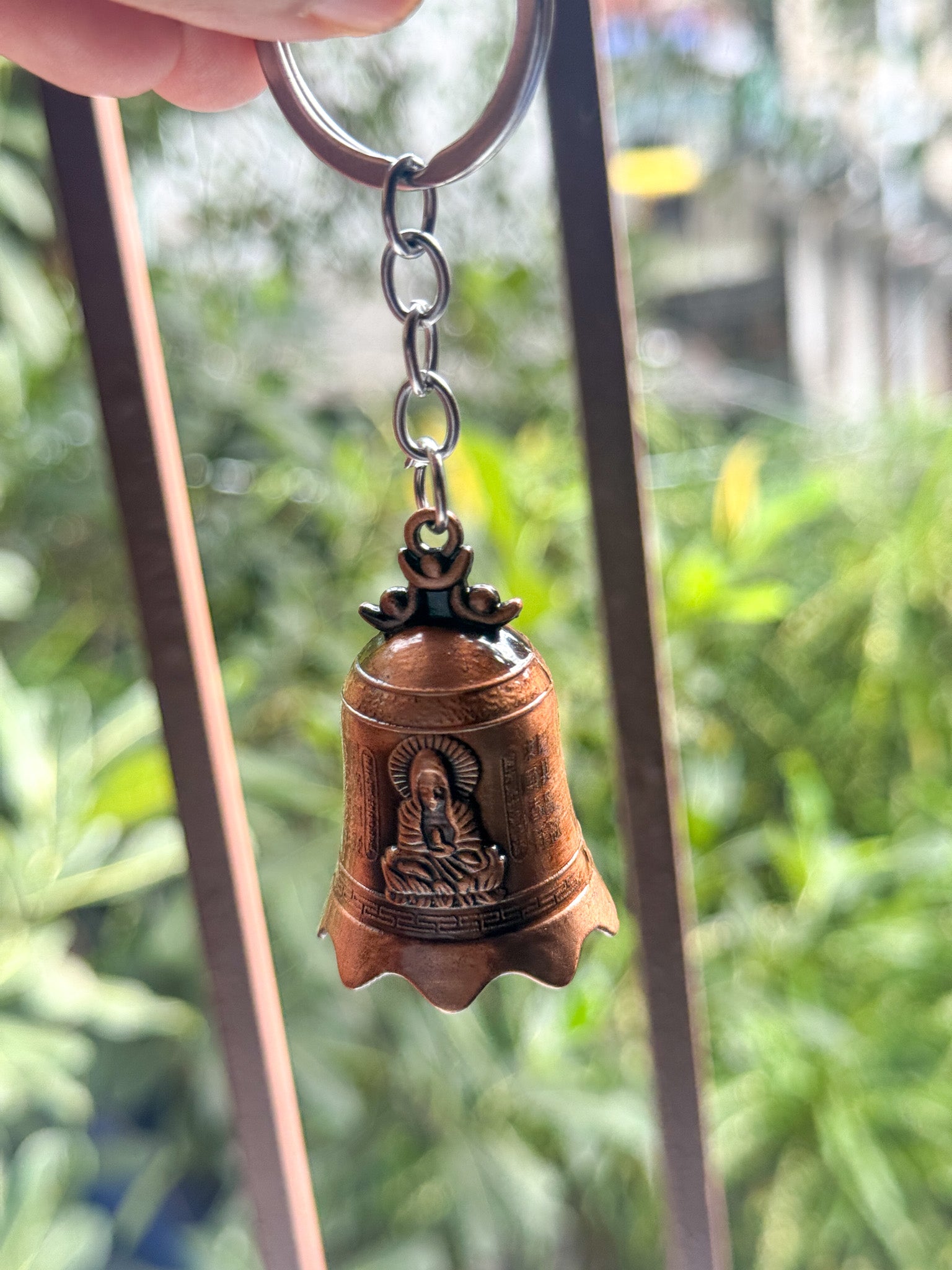 Antique Buddha Guardian Bell || Keychain | Vintage Bike or Car Pendant Key Ring | Spiritual Lucy Charm | Brown & Silver & Gold |