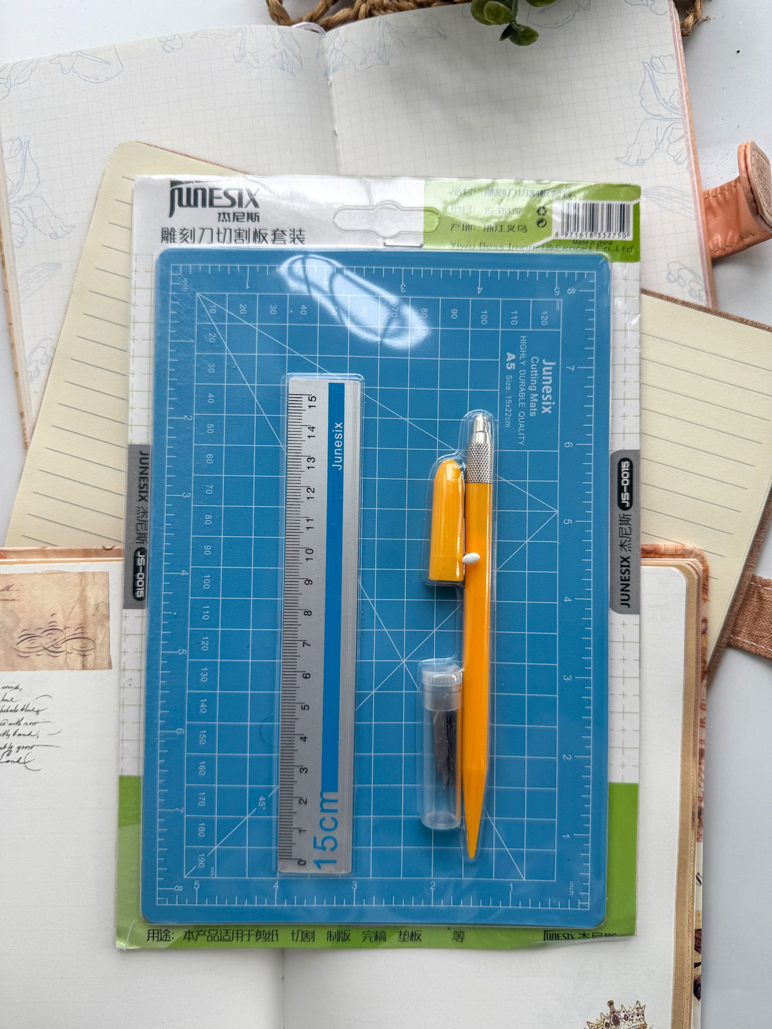 Js0015- Cutting mat With Pen Knife And Metal Scale Blue | Set With Extra Blades