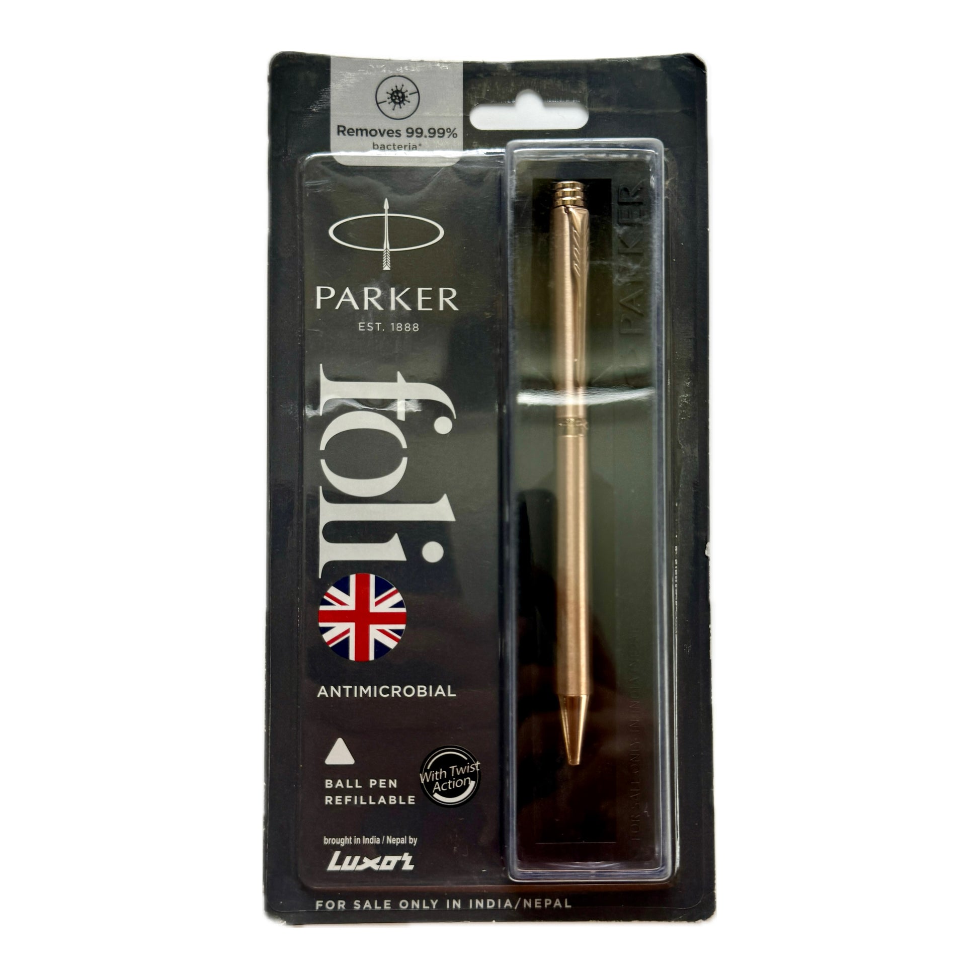 Parker Folio Stainless Steel Chrome Trim Ball Pen with 1 Blue Refill. Copper | Fine Point | Blue Ink | Refillable