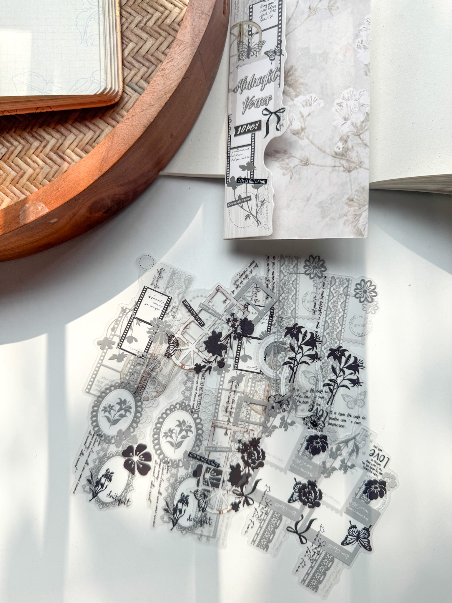 Transform your space with this elegant transparent sticker sheet collection. Each of the six sheets features beautifully rendered tree silhouettes and shadow designs, perfect for adding artistic depth to windows, laptops, or glass surfaces. The sophisticated monochromatic aesthetic complements modern and minimalist interiors while maintaining versatility across décor styles. These transparent stickers allow your existing background to show through, creating a layered visual effect that's both understated and striking. Ideal for those seeking to elevate their environment with nature-inspired artistry.
